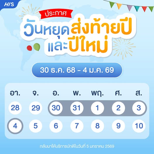 เอชไอเอส ทัวร์ส์ ขอแจ้งปิดทำการในวันส่งท้ายปี และวันหยุดปีใหม่